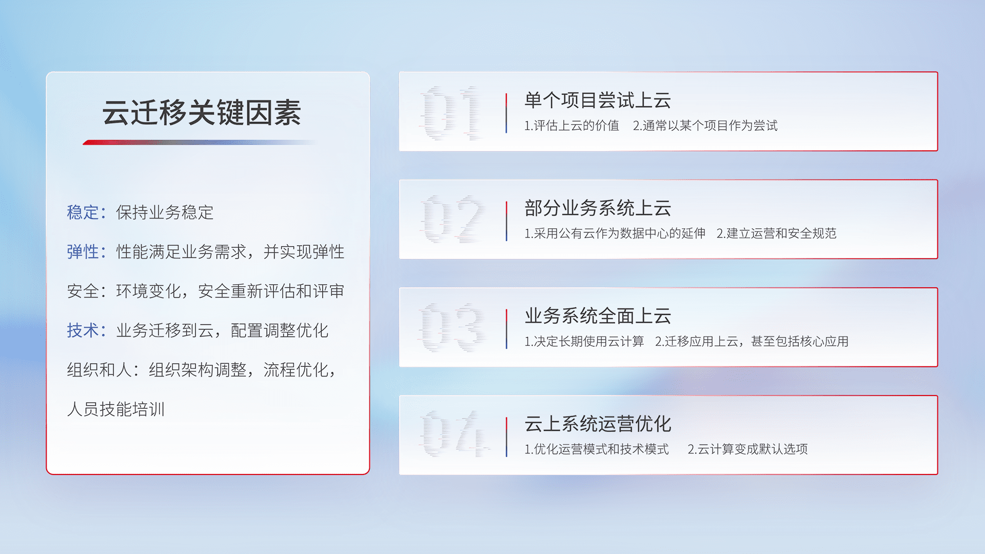 结合实际业务,,,从规划设计、、云平台选型、、、云原生改造、、数据迁移、、、集成交付,,,迁移全过程为客户识别最佳上云路径,,,做好风险识别管理,,设计网络架构、、、身份权限、、、安全审计合规、、操作审计、、、、日志审计、、、监控告警策略、、、多站点容灾设计等,,,,对云上基础设施进行整体规划,,提升IT治理水平,,,,以满足弹性、、、高可用、、、、高性能的需求。。