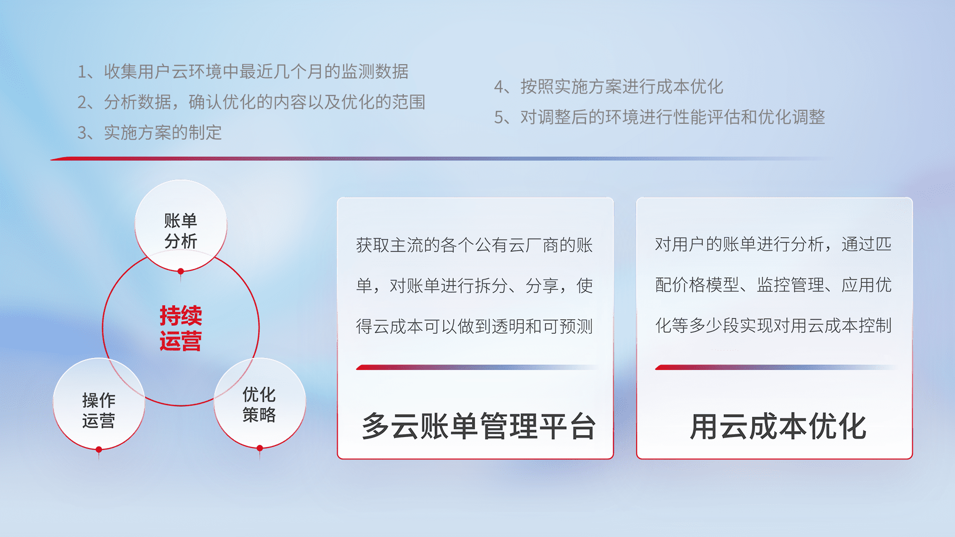 通过多云纳管,,以统一的资源数据模型把客户的云资源进行抽象和封装,,进而实现对多云资源的统一操作,,保障云资源管理的可靠性、、、稳定性与可用性。。。。量身定制化运维内容,,,配置、、开发运维、、、补丁管理、、、、备份、、、、监控、、、认证和访问管理、、、、审计和日常巡检等,,保障在用云过程中的可靠度,,,,稳定度以及高可用率。。